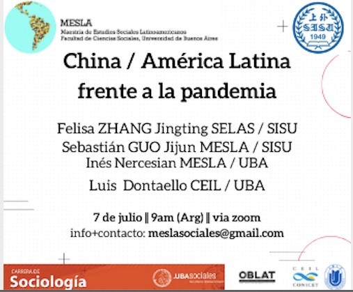 在全球新冠疫情期间,西方语系拉丁美洲区域国别研究生项目师生积极传播我国在抗击疫情方面所做的努力,与拉丁美洲的专家开展了线上和线下的学术讨论。7月7日,西方语系同阿根廷布宜诺斯艾利斯大学社会学院共同进行了“疫情下的中国与拉丁美洲关系”线上学术对话。活动由阿根廷布宜诺斯艾利斯大学社会科学系负责人Verónica Giornado主持,布宜诺斯艾利斯大学社科系教授Inés Nercesian、教授Luis Dontaello、上外西方语系教师张婧亭和拉美研究方向研究生郭纪君等五名同学参与交流。
