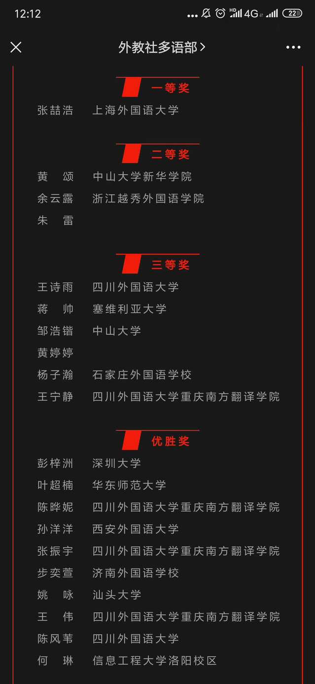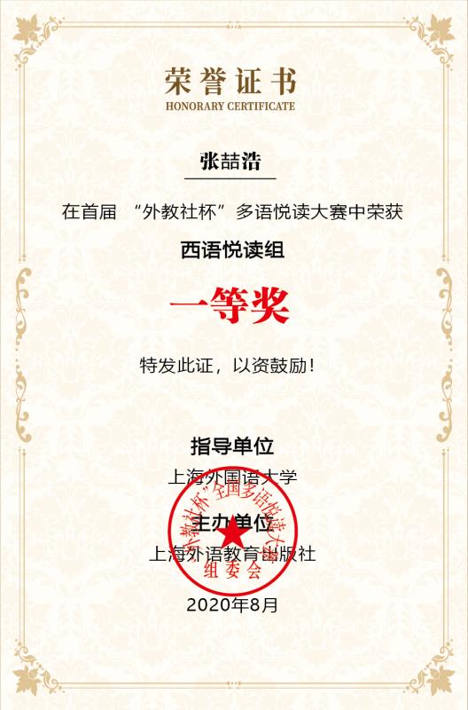 近日,在首届“外教社杯”多语悦读大赛中,上海外国语大学西方语系西班牙语专业2019级学生张喆浩荣获一等奖。此外,我系2017届西班牙语专业校友朱雷获得二等奖。