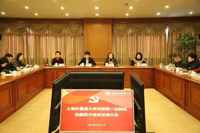 根据校党委统一部署,近日,上海外国语大学党委第一巡察组向西方语系党总支反馈巡察情况。2021年1月6日,上海外国语大学党委第一巡察组组长石彤喆向西方语系党总支书记施海倩、系主任于漫进行个别反馈,会上校党委副书记、纪委书记、巡察工作领导小组副组长钱玲传达校党委指示精神并开展全面从严治党工作谈话。2021年1月14日,石彤喆代表上海外国语大学党委第一巡察组进行大会反馈。副校长张静传达校党委指示精神并对巡察整改工作提出要求。施海倩作表态发言,于漫主持会议。