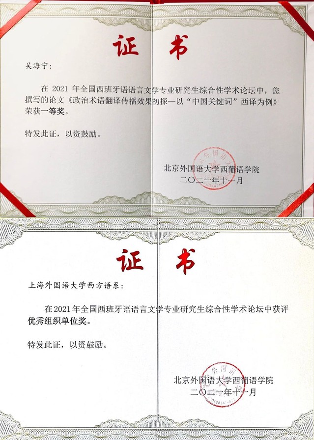 2021年第二届全国西班牙语语言文学专业研究生综合性学术论坛由北京外国语大学西葡语学院主办,旨在增强西班牙语语言文学研究生学术创新意识和科研能力,增进国内外高校研究生之间的学术交流。本次论坛共设翻译研究、国家和区域研究、文学研究和语言学研究四个方向、六个分会场,吸引了来自国内外15所高校的硕博研究生参加。经专家评审,四个研究方向共评选出一等奖6名,二等奖12名和优秀奖24名。