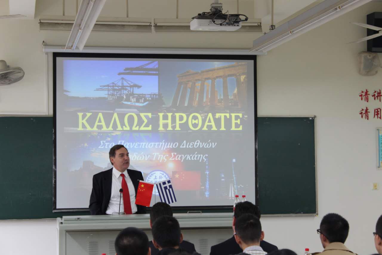 会谈后,罗卡纳斯大使来到西方语系,为师生作了一场题为“中希友谊:两国关系和未来前景”的英文讲座,深入介绍了两国在政治、经济、文化方面的合作与交流。他从中国人和希腊人的思维方式角度,分析了两国的哲学思想、生活方式及文化教育的相似之处。他指出,希腊和中国作为历史悠久的文明古国,两国文化历经几千年的进化与发展,同中存异,能够互相理解,有着天然的合作优势。大使还以中远集团收购希腊比雷埃夫斯港港务局股份为例,向师生们介绍了近年来中希两国在经贸领域的合作成果。最后,大使先生勉励同学们刻苦学习,多进行跨文化交流,为未来成为中国和希腊以及中国和世界的交流使者做好准备。通过讲座并和大使互动,在场的同学们都对自己作为卓越国际化人才的使命有了更深的理解,受益良多。