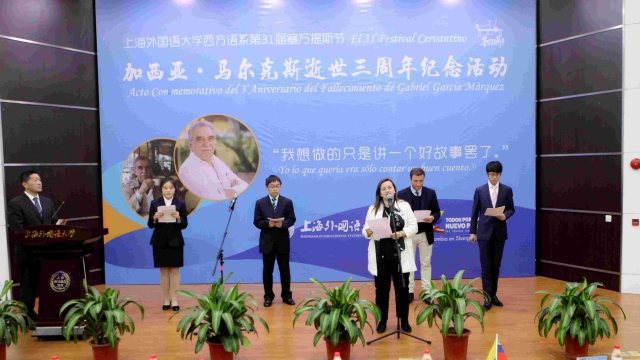2017年4月17日下午,上海外国语大学西方语系第31届塞万提斯节系列活动之加西亚•马尔克斯逝世三周年纪念活动在上海外国语大学松江校区图文西厅举行。上海外国语大学副校长杨力,哥伦比亚、智利、委内瑞拉、古巴、乌拉圭、秘鲁、厄瓜多尔、阿根廷等八国驻沪领馆领事,著名拉美文学翻译家黄锦炎、陈泉,知名书评人何平,校对外合作交流处处长张红玲,西方语系党总支书记忻炯俊,副系主任杨明,党总支副书记张敏和全系师生出席此次活动。