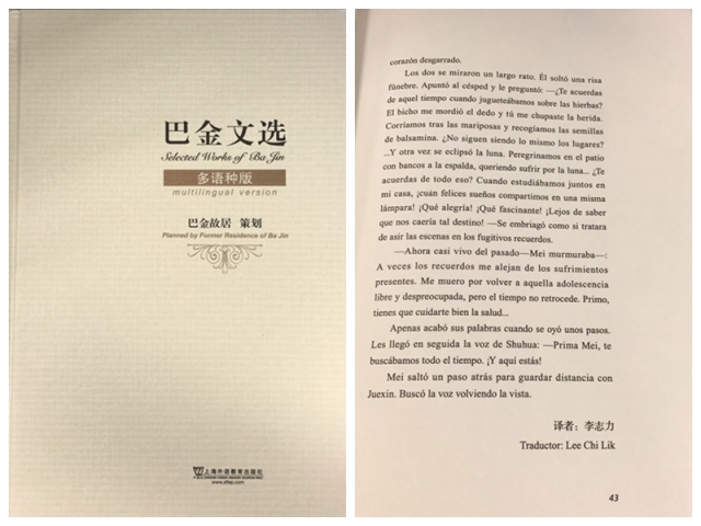 近日,巴金故居策划《巴金文选》(多语种版)由上海外语教育出版社出版,选录了英语、法语、俄语、阿拉伯语、西班牙语、日语、德语七个语种的优秀译文,我系西班牙语专业学生李志力的翻译作品入选。