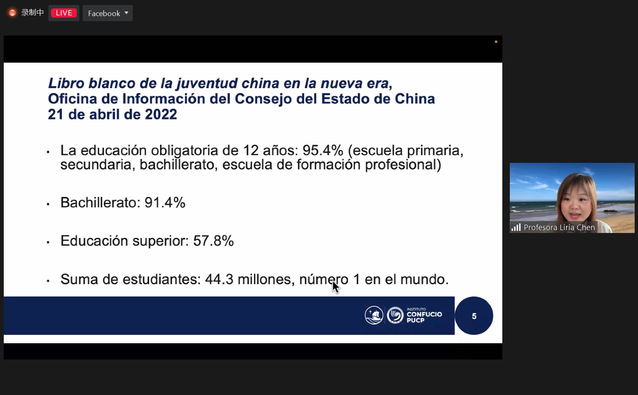 20221118日上午,应秘鲁天主教大学孔子学院的邀请,上海外国语大学西方语系陈芷副教授做了题为“建设未来的青年一代:中国与明天”的讲座,共计百余名孔院师生及西语爱好者参与其中。讲座过程中,陈芷副教授以国务院新闻办于今年4月发布的《新时代的中国青年》白皮书为切入点,分别从学习、工作和生活三方面向孔院师生介绍了中国的当代青年。