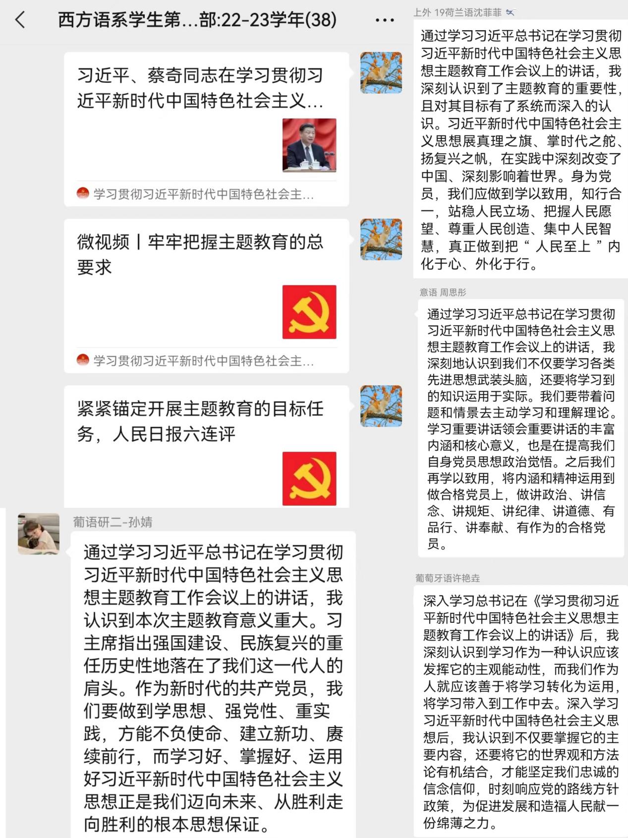 西方语系学生党员认真学习领悟习近平总书记在学习贯彻习近平新时代中国特色社会主义思想主题教育工作会议上的讲话,积极交流分享学习体会,从讲话精神中汲取思想伟力、找准奋斗方向,为强国建设贡献力量。