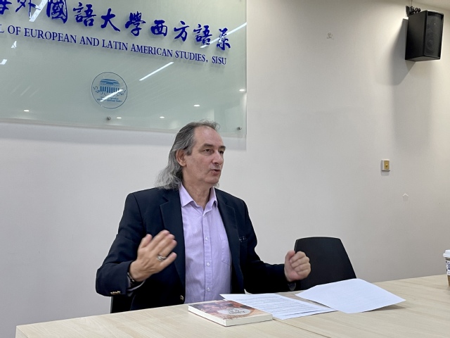 对谈会上,Lampropoulos先生首先感谢在座的同学选择学习希腊语和希腊文化,正是因为他们的热爱,才有机会接触这一古老的文化,了解其背后的精神内涵。他和同学们畅谈自己的人生经验,讲述了精神和语言的关系。他以古希腊神话为例,分析了神话故事背后的象征意义,同时介绍古希腊哲学的精神世界,鼓励同学们如何将梦想付诸行动,如何摈弃金钱的诱惑,如何克服恐惧,尊崇自己的内心,成为一个真正优秀的人。随后他介绍了自己创作的历史小说《太阳的女儿》,以及书中所要传递的古希腊文化精髓和人生真谛。Lampropoulos先生旅居中国多年,他也表达了自己对中国文化的热爱,其下一本小说的主要内容就是将中国与希腊的哲学联系在一起。