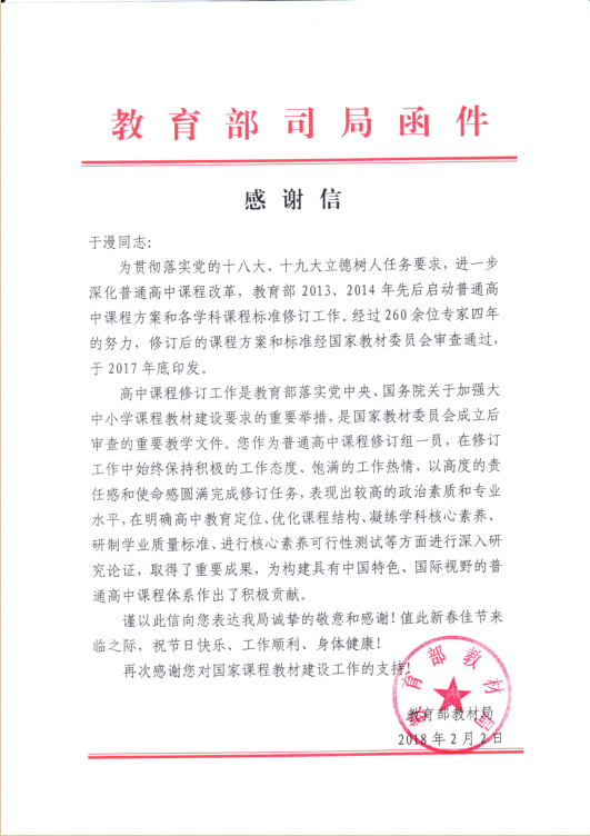 日前,上海外国语大学西方语系于漫教授收到教育部教材局发来信函,对其参加普通高中课程方案和各学科课程标准修订工作致以感谢。