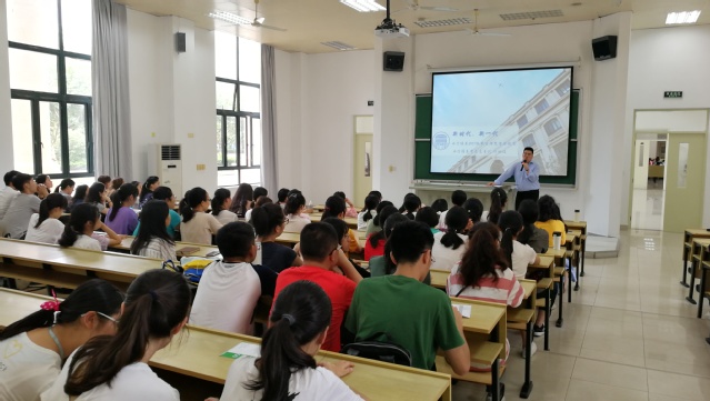 912日下午,西方语系2018级新生理想信念教育在松江校区举行,系党总支书记忻炯俊老师以“新时代,新一代”为题,向西方语系2018级全体本科新生上了关于大学生活的第一课。