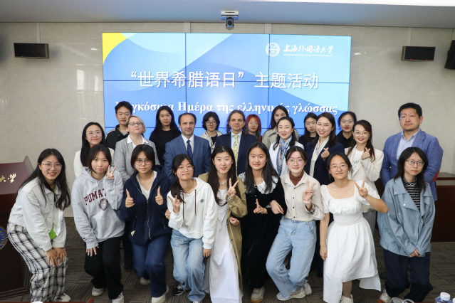 在上外“世界希腊语日”主题活动中,希腊驻沪总领馆公共外交副领事詹姆斯先生向希腊语专业全体师生作题为“计算模型中的希腊哲学方法论”的演讲,希腊语专业还介绍了专业教师的最新研究成果。之后,希腊语专业全体学生表演了原创的希腊语诗歌并展示了自制的中希双语视频。