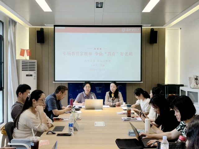 2024年7月1日,西方语系根据学校“院长讲师德”专项行动部署,由系主任于漫围绕“弘扬教育家精神,争做‘四有’好老师”主题为全系教职工开设“院长讲师德”专题讲座。