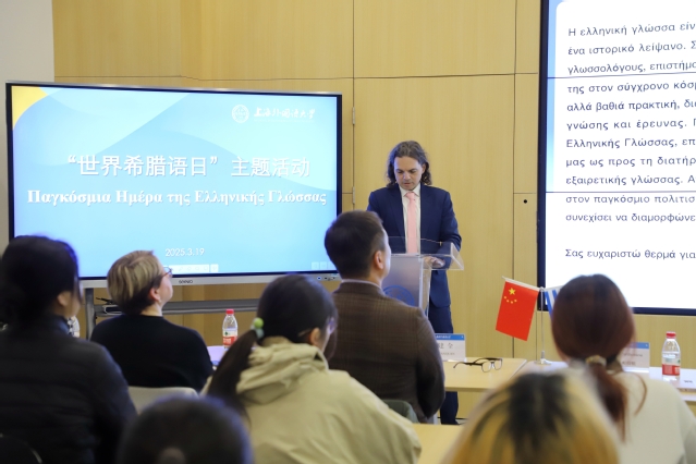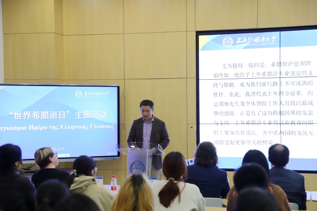 3月19日下午,2025年“世界希腊语日”主题活动在上海外国语大学图书馆数字学术中心举办。西方语系副主任王建全、希腊驻沪总领事乔治·帕特纽(Georgios Patheniou)先生、希腊驻沪总领馆公共外交领事詹姆斯(Dimitrios Foukis)等嘉宾出席此次活动。活动由西方语系希腊语专业负责人、希腊研究中心主任胡晶晶主持。